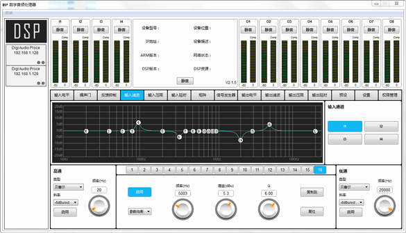 本4进8出的音箱处理器,使用最新的第四代SHARC ADSP-21488 400Mhz浮点DSP,具有强大的DSP处理能力。每个输入、输出有16段参数滤波器,增益控制、噪声门功能、RMS压限、内置的粉红/白噪声发生器,以及可调的延时。分频器的斜率从6dB/Oct48dB/Oct范围内可选。延时步进精度0.02ms,电平增益精度0.1dBu,满足现场精细调节。AD-DA动态范围114dBu。系统动态范围110dBu。每个输入通道包含噪声门,反馈抑制器,压限器。100M以太网接口。PC软件自动发现处理器。32种系统预设。通道参数快速拷贝。